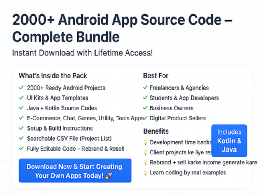 2000+ Android Apps ka full source code pack – Java & Kotlin projects, UI Kits, Templates & Business Apps.